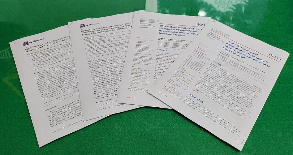 ¼¼ ¹øÂ°·Î´Â Áö³ 2 ¿ù 18 ÀϺÎÅÍ 6 ¿ù 30 ÀϱîÁö µ¿±¹´ë °æÁÖº´¿øÀ̳ª ¾Èµ¿ÀÇ·á¿ø¿¡ ÀÔ¿øÇÑ ÁßÁõ±Þ¼ºÈ£Èí±âÁõÈıº (SARS-CoV-2) °¨¿° È®Áø ȯÀÚ 352 ¸íÀ» ´ë»óÀ¸·Î ÀÇ·á ±â·ÏÀ» °ËÅäÇϰí ÀÔ¿ø ½Ã µ¿¹Ý¼º , Áõ»ó , ¹æ»ç¼± ¹× ½ÇÇè½Ç ¼Ò°ßÀ» Æ÷ÇÔÇÑ Àα¸Åë°èÇÐÀû ¹× ÀÓ»óÀû Ư¡À» ºÐ¼®ÇÏ°í »ç¸Á·üÀÇ À§Çè ÀÎÀÚ¸¦ ¾Ë¾Æº» ¿¬±¸ ³í¹® ¡°Clinical Characteristics and Mortality Predictors of COVID-19 Patients Hospitalized at Nationally-Designated Treatment Hospitals¡±( ¹®¼º¼ö , À̰ü , ¹ÚÁرâ , À±¼ºÃ¶ , ÀÌÀ±½Ä , À̵¿¼® , J Korean Med Sci. 2020 Sep 14;35(36):e328) ÀÌ¸ç ³× ¹øÂ°·Î´Â Çѱ¹¿¡¼ À̽º¶ó¿¤·Î ¼ºÁö¼ø·Ê¸¦ ´Ù³à¿Â 39 ¸í¿¡¼ ¹ß»ýÇÑ Äڷγª À¯ÇàÀÇ °¨¿°¿ø°ú ÀÓ»óÁõ»óÀ» ÆÄ¾ÇÇϰí ÃßÀû°Ë»ç¸¦ ÅëÇÏ¿© ¹ÙÀÌ·¯½º ¹èÃâ·®À» ÆÄ¾ÇÇÑ ¿¬±¸ ³í¹® ¡°COVID-19 Outbreak and Presymptomatic Transmission in Pilgrim Travelers Who Returned to Korea from Israel¡±( ¹ÚÁöÇõ , ÀåÁØÈ£ , À̰ü , À¯¼®ÁÖ , ½ÅÈ¿Á¤ , J Korean Med Sci. 2020 Dec 14;35(48):e424) À» ¹ßÇ¥ÇÏ¿´´Ù .