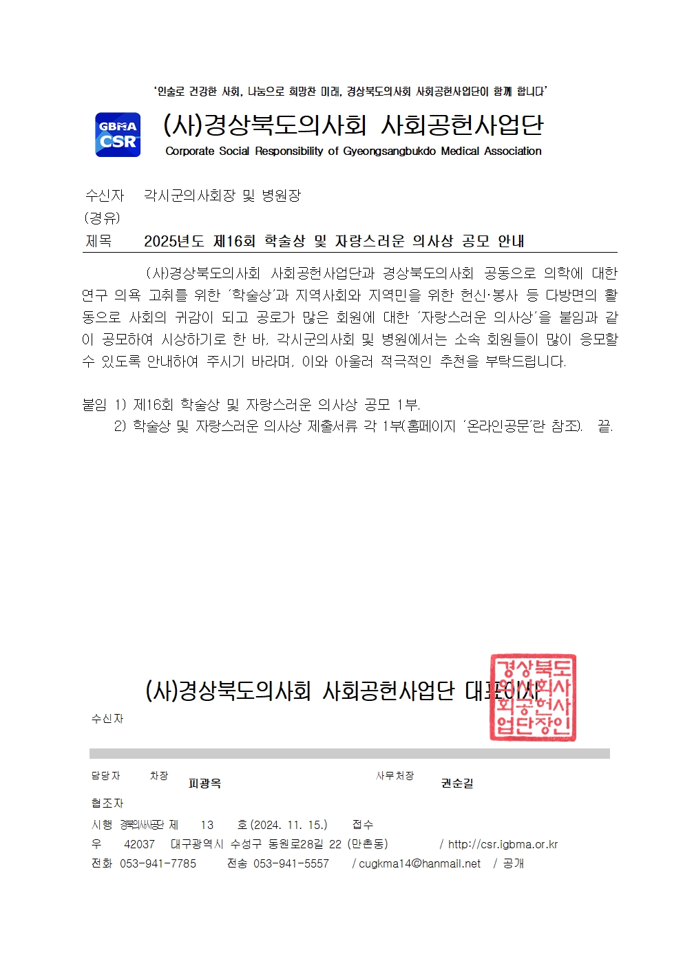 ( »ç ) °æ»óºÏµµÀÇ»çȸ »çȸ°øÇå»ç¾÷´Ü°ú °æ»óºÏµµÀÇ»çȸ °øµ¿À¸·Î ÀÇÇп¡ ´ëÇÑ ¿¬±¸ ÀÇ¿å °íÃ븦 À§ÇÑ ¡® Çмú»ó ¡¯ °ú Áö¿ª»çȸ¿Í Áö¿ª¹ÎÀ» À§ÇÑ Çå½Å ¡¤ ºÀ»ç µî ´Ù¹æ¸éÀÇ È°µ¿À¸·Î »çȸÀÇ ±Í°¨ÀÌ µÇ°í °ø·Î°¡ ¸¹Àº ȸ¿ø¿¡ ´ëÇÑ ¡® ÀÚ¶û½º·¯¿î ÀÇ»ç»ó ¡¯ À» ºÙÀÓ°ú °°ÀÌ °ø¸ðÇÏ¿© ½Ã»óÇϱâ·Î ÇÑ ¹Ù , °¢½Ã±ºÀÇ»çȸ ¹× º´¿ø¿¡¼´Â ¼Ò¼Ó ȸ¿øµéÀÌ ¸¹ÀÌ ÀÀ¸ðÇÒ ¼ö ÀÖµµ·Ï ¾È³»ÇÏ¿© Áֽñ⠹ٶó¸ç , ÀÌ¿Í ¾Æ¿ï·¯ Àû±ØÀûÀÎ ÃßõÀ» ºÎʵ右´Ï´Ù .