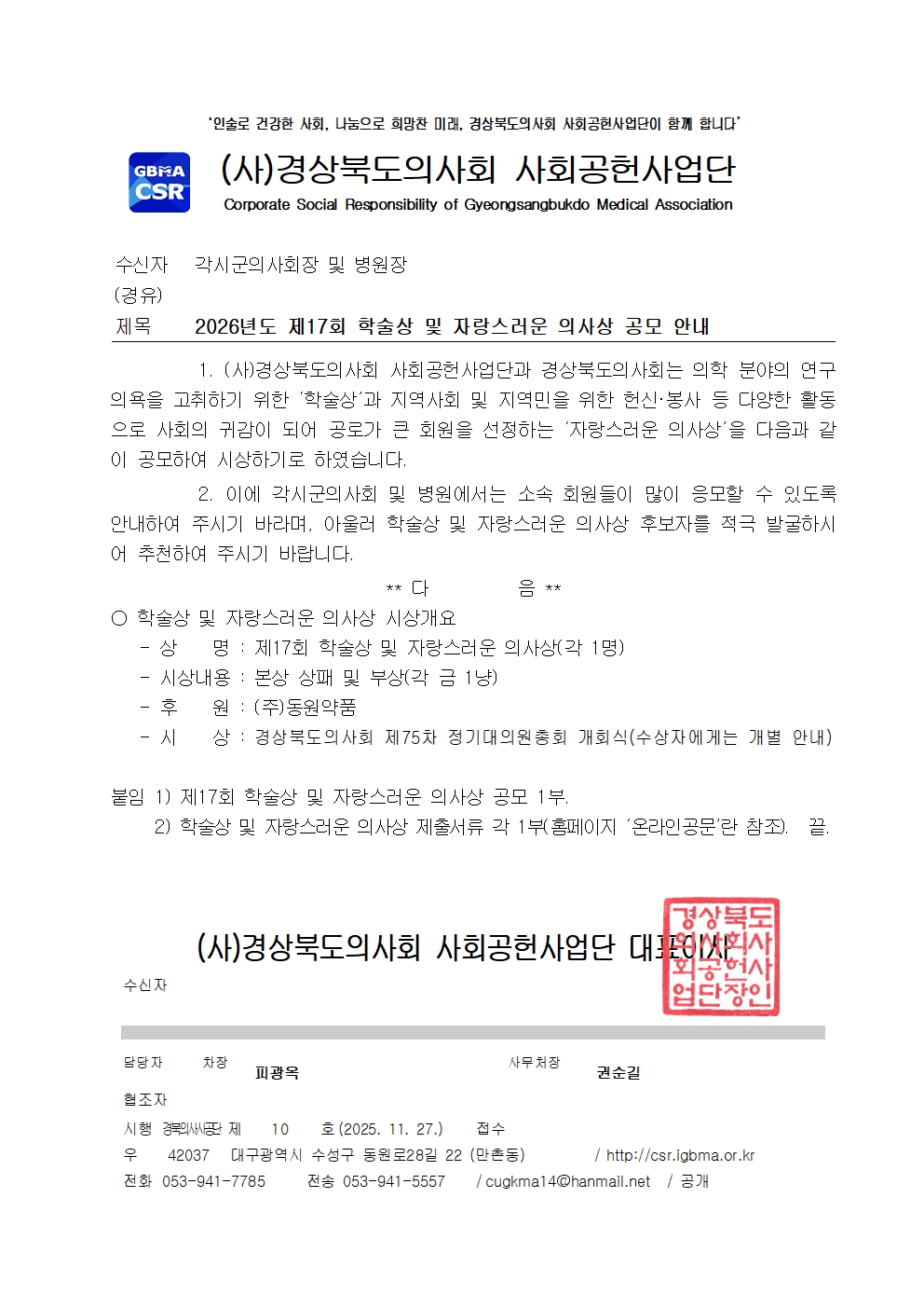 ( »ç ) °æ»óºÏµµÀÇ»çȸ »çȸ°øÇå»ç¾÷´Ü°ú °æ»óºÏµµÀÇ»çȸ´Â ÀÇÇÐ ºÐ¾ßÀÇ ¿¬±¸ ÀÇ¿åÀ» °íÃëÇϱâ À§ÇÑ ¡® Çмú»ó ¡¯ °ú Áö¿ª»çȸ ¹× Áö¿ª¹ÎÀ» À§ÇÑ Çå½Å ¡¤ ºÀ»ç µî ´Ù¾çÇÑ È°µ¿À¸·Î »çȸÀÇ ±Í°¨ÀÌ µÇ¾î °ø·Î°¡ Å« ȸ¿øÀ» ¼±Á¤ÇÏ´Â ¡® ÀÚ¶û½º·¯¿î ÀÇ»ç»ó ¡¯ À» ´ÙÀ½°ú °°ÀÌ °ø¸ðÇÏ¿© ½Ã»óÇϱâ·Î ÇÏ¿´½À´Ï´Ù .